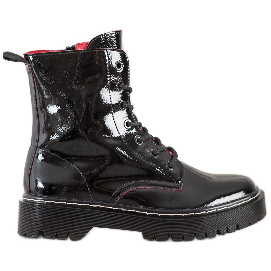 Made of high-quality eco-leather, the workers offer not only an aesthetic appearance but also durability. Their patent finish gives them a unique character that is sure to catch the eye. The width of the upper of 24 cm and the height above the ankle (14-15 cm) ensure a perfect fit, and the round toe increases comfort.