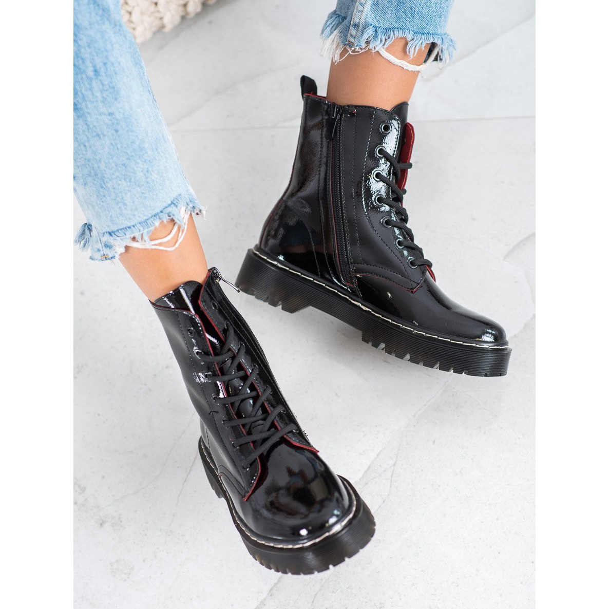 Discover the patent leather VINCEZA workers in classic black, which will become an inseparable element of your everyday styling. These elegant shoes combine casual and rock style, perfect for everyday wear.