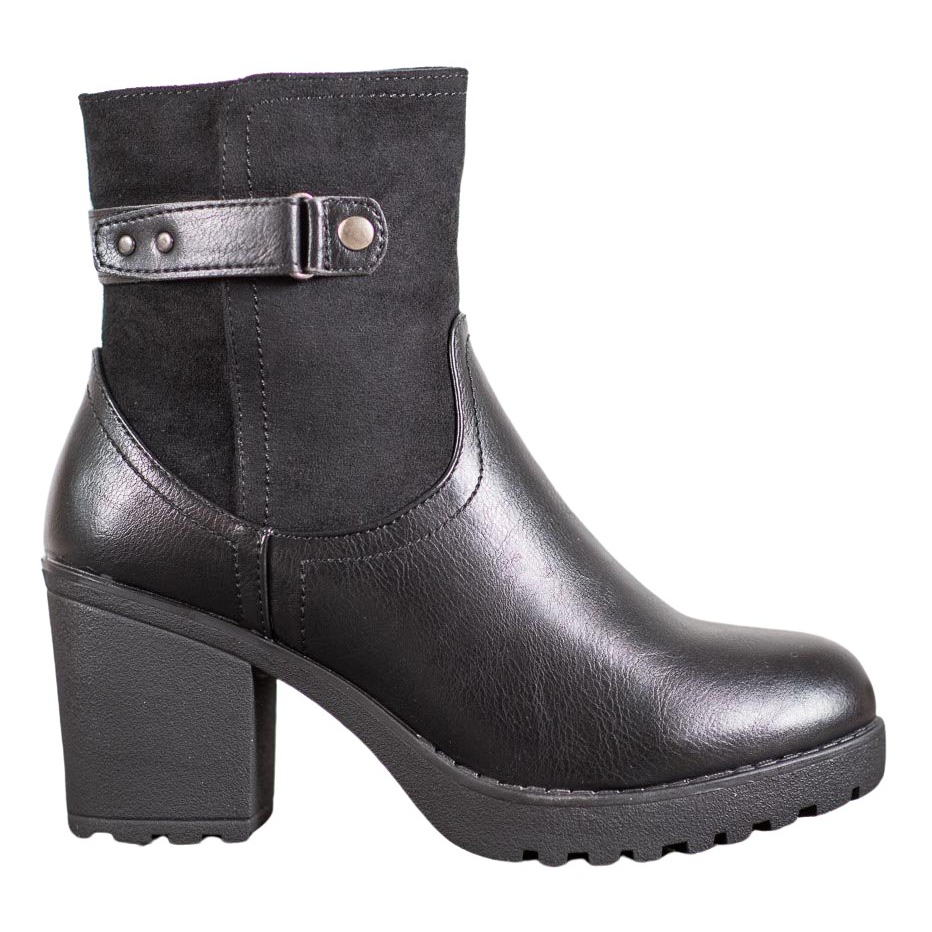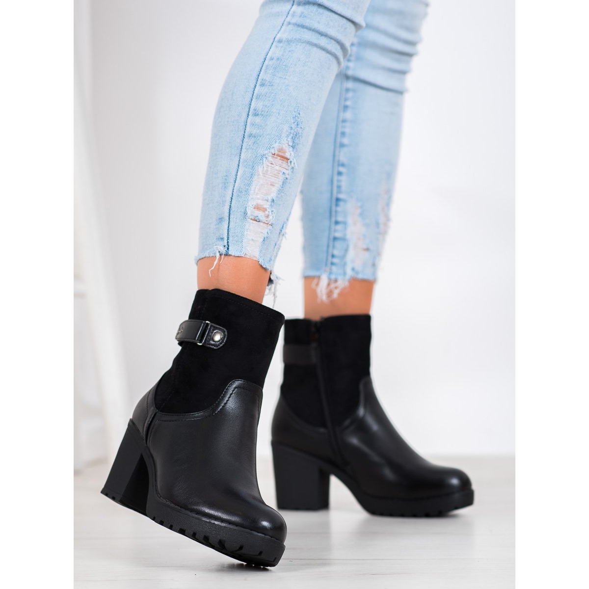 Discover warm ankle boots with a block heel from J. Star – perfect for colder days! These stylish, black women's ankle boots combine comfort with a fashionable design, making them a perfect match for casual and fashionable styles. Made of eco-leather and partially decorated with a suede finish, they are an elegant addition to any autumn-winter styling.