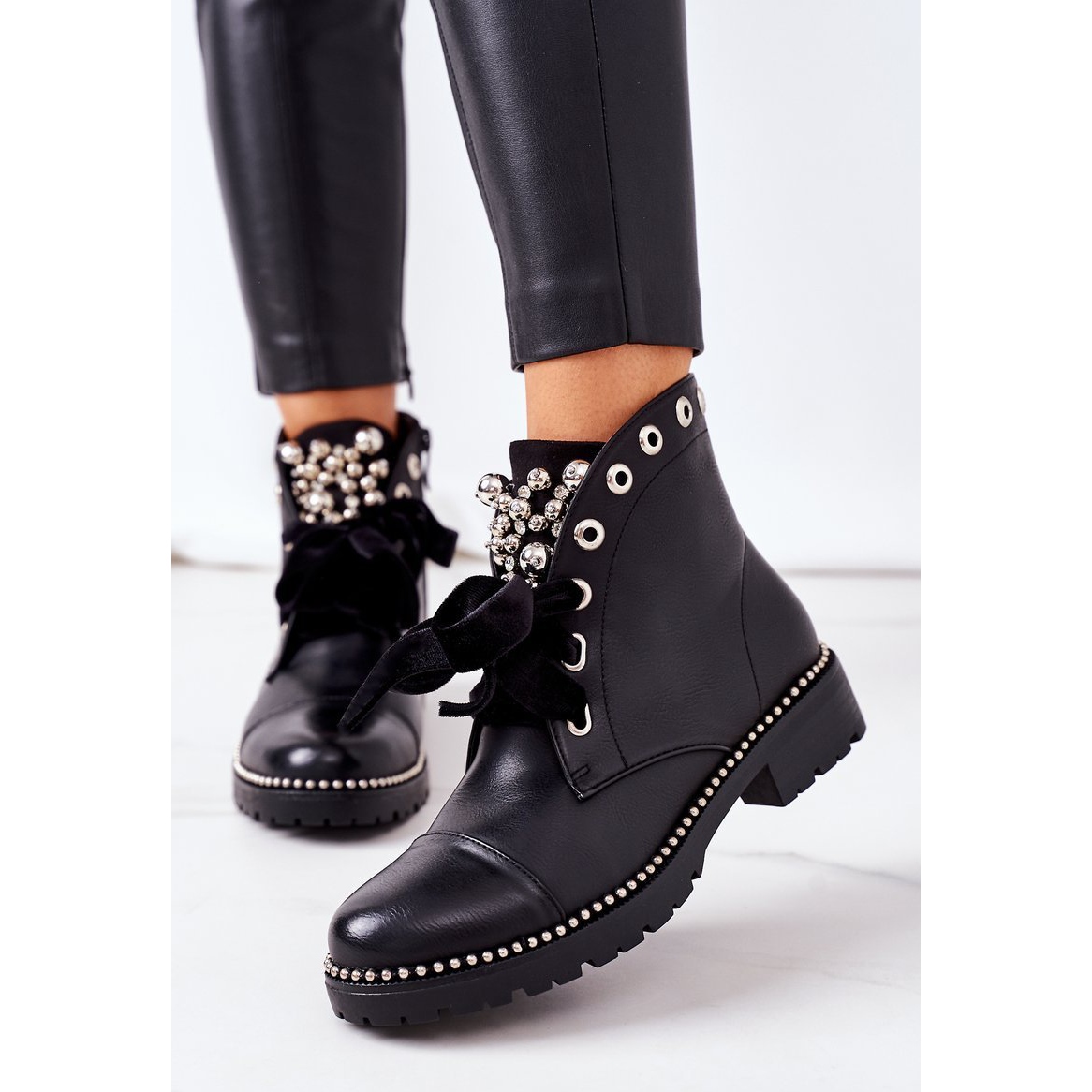 The model is characterized by an original upper cut and unique decorations. Metal pearls, jets and ribbon give the shoes a unique charm, thanks to which they will certainly attract the attention of others. The boots are available in classic black, which makes them a universal addition to many styles.