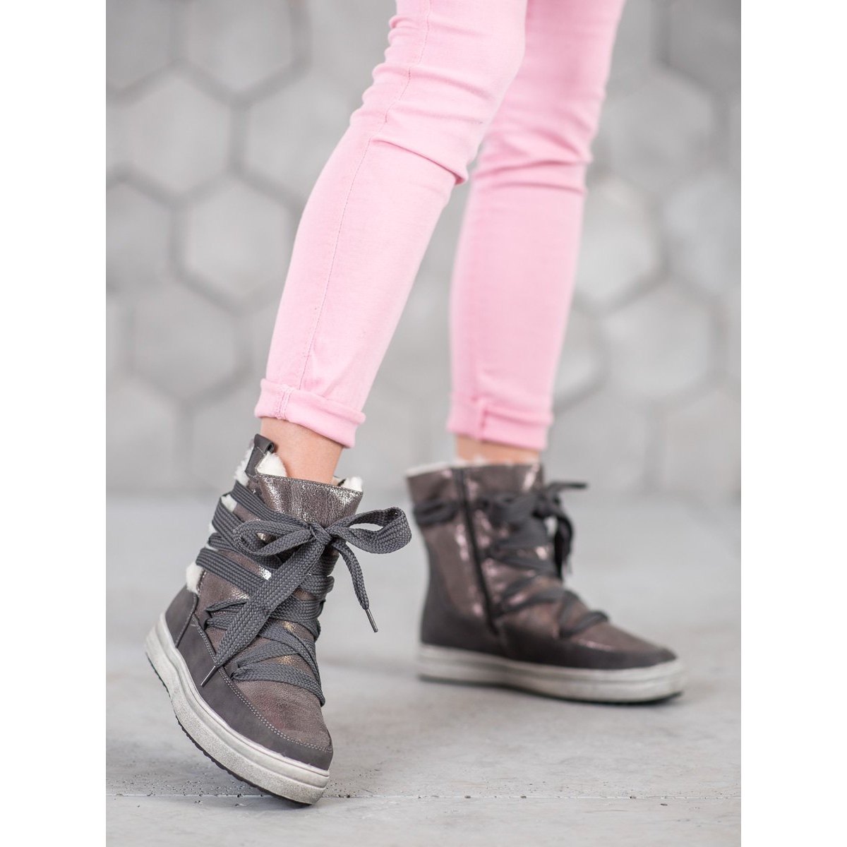 SDS designers managed to create footwear that will not let low temperatures spoil your fashion plans. The combination of imitation leather and textile material in a 50:50 ratio gives an effect that is both noble and durable. These gray snow boots will surely surprise you with their universality - they match a wide range of winter outfits, from jeans to more casual skirts and dresses.