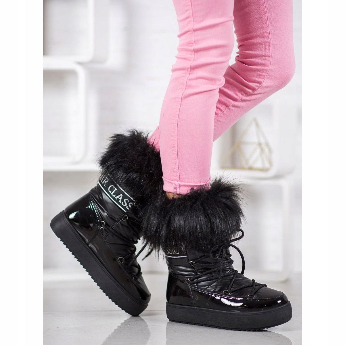 The snow boots are elegantly black, which makes them suitable for various outfits and occasions. The high upper (19-20 cm) and width (32-34 cm) ensure a perfect fit, and the lacing and slip-on fastening make them easy to put on and take off. In turn, the synthetic sole with tread provides stability and grip, which is extremely important during winter walks.