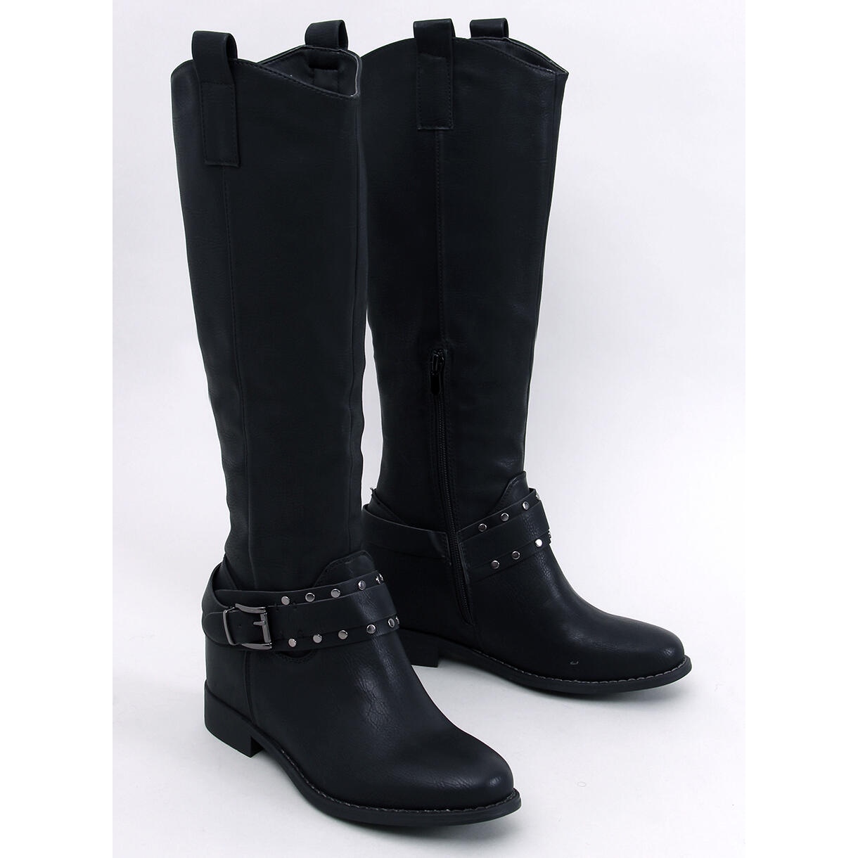 The Watson Black Hidden Wedge Boots are the perfect choice for any modern woman who wants to combine comfort with fashionable style. These black knee-high boots feature a unique cowboy boot design, decorated with spectacular buckles and rhinestones, giving them a unique character.