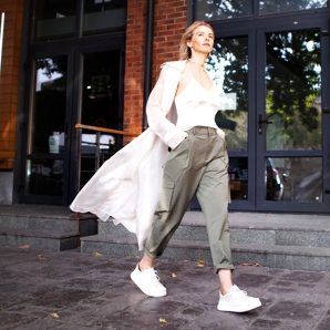 Down outfits fit comfortable sneakers in a sporty style. What about leather model in shades of beige with animal prints? The stiffened heel counter will provide additional stability, and the non-slip sole will ensure your safety during the day.