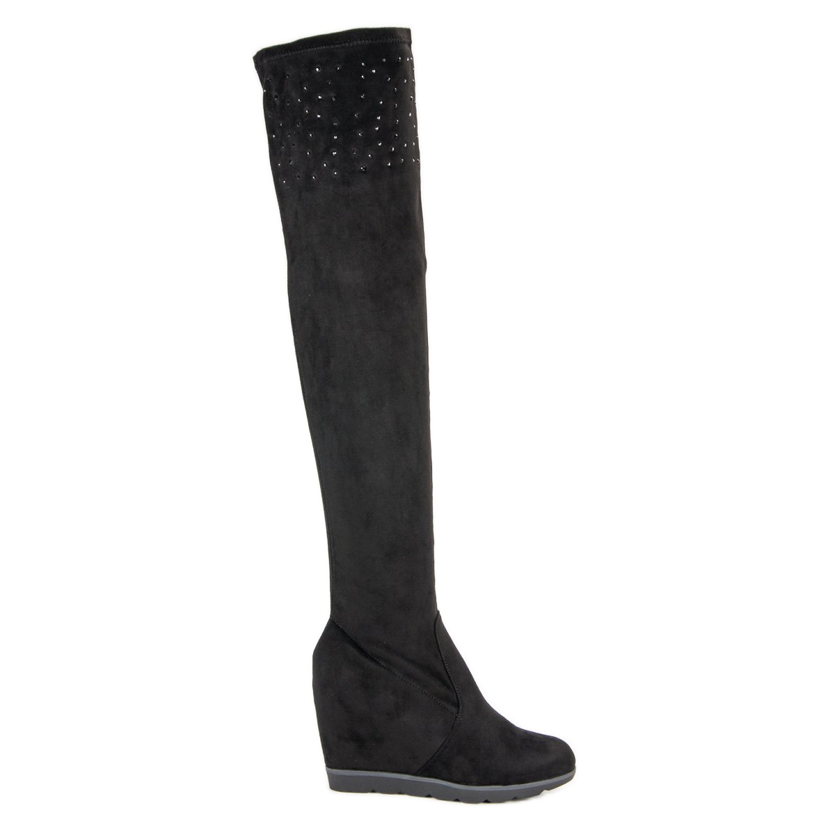 These over the knee boots have a stable 9.5 cm wedge heel, which makes them comfortable and ideal for wearing for many hours. Additionally, the zip fastening makes it easy to put on and take off the shoes, and delicate rhinestones add a fashionable character to them. The round toe provides adequate space for the toes, which increases the comfort of wearing.