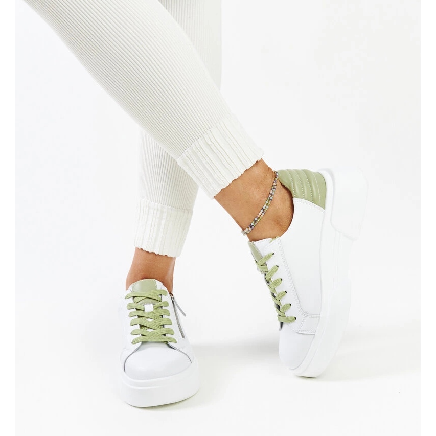 White-green leather sneakers Atyaf is the perfect choice for women who value comfort and fashionable design. These sports shoes from a reputable brand Another brand combine the elegance of white natural leather with a bit of freshness of green accents, which makes them a unique element of every spring and summer styling.