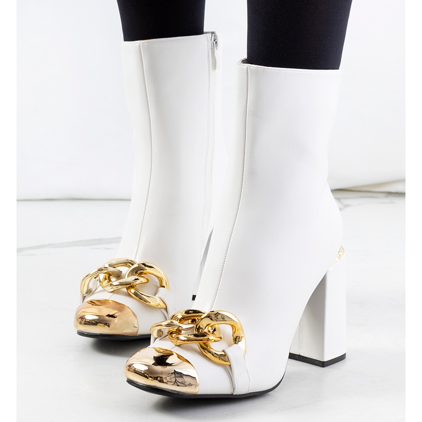 Modern Engi boots are a proposal for women who value a combination of style and comfort. Made of high quality ecological leather, they provide a convenient fit and easy care. A stable, 8.5 cm post subtly slim the figure, and a square nose decorated with a golden plate and a chain adds a stylish character. The zip fastener makes it easier to insert, and the standard numbering allows you to follow the usual size.