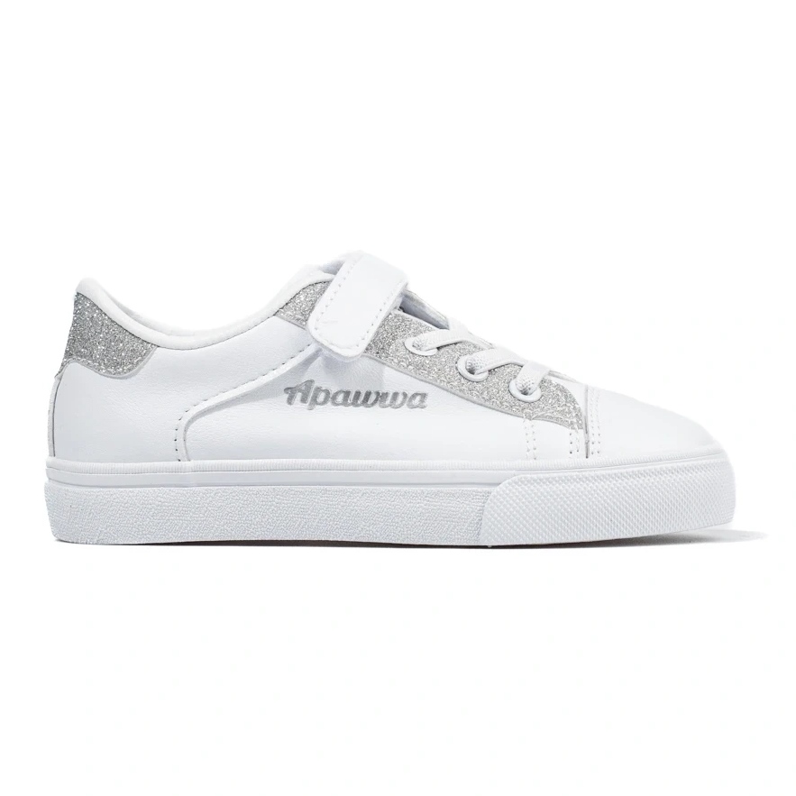 Stylish and comfortable sneakers for girls combining a sporty character with a shiny accent. White with silver glitter, on practical Velcro - perfect for school, kindergarten and every day.