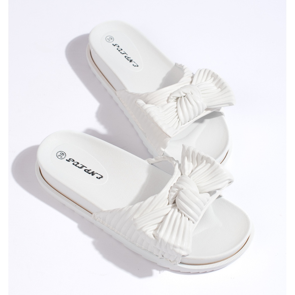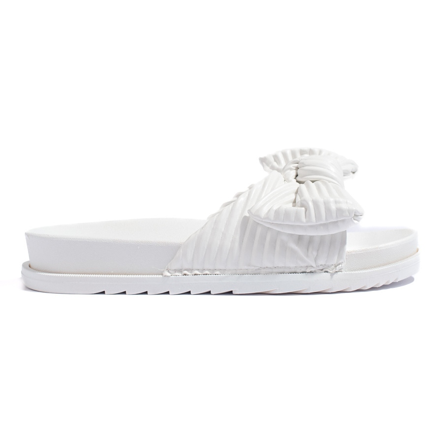 The sole made of plastic with a height of 3 cm ensures stability and cushioning, thanks to which each step becomes a pleasure. The flip flops have a inserted clasp, which makes it easier to put on and take off, and the white color emphasizes their elegance.