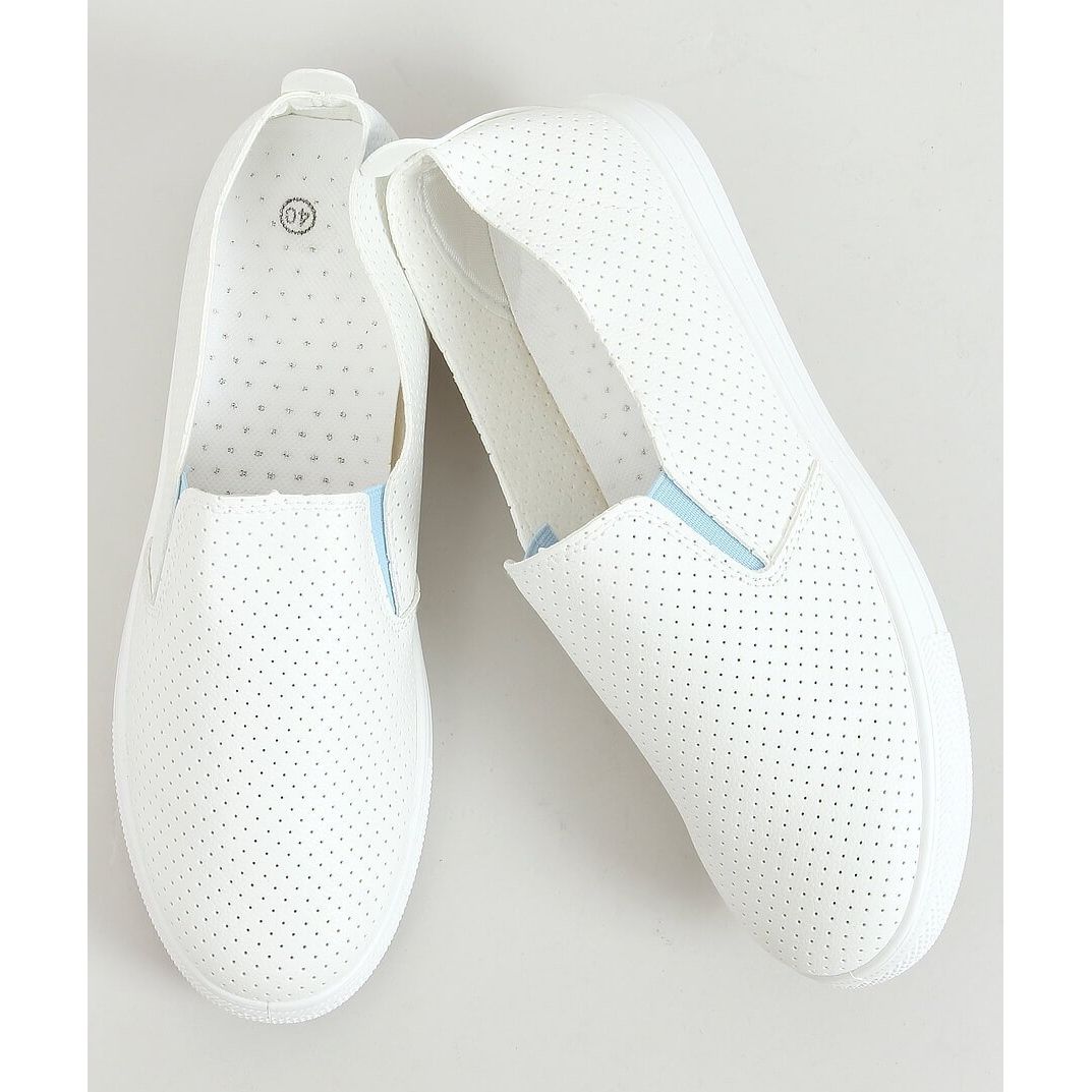 We present the white LA45 Blue slip-on sneakers with blue accents - the perfect addition to your spring wardrobe! These stylish women's sneakers are characterized by a modern design and are a perfect complement to casual stylings. Made of delicate eco-leather with an openwork texture, they guarantee not only a fashionable look, but also comfort of wearing.