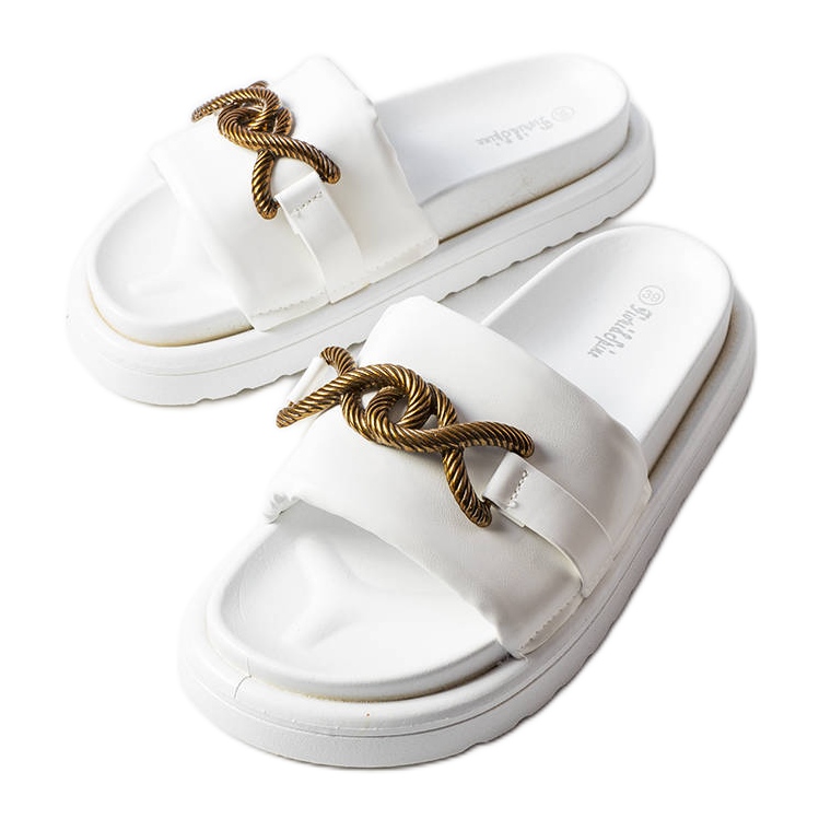 White flip flops on the frédérique platform - elegant and comfortable slip -in women's slippers with a delicate gold chain. Perfect for the summer - for everyday stylizations, walks around the city or on holiday trips.