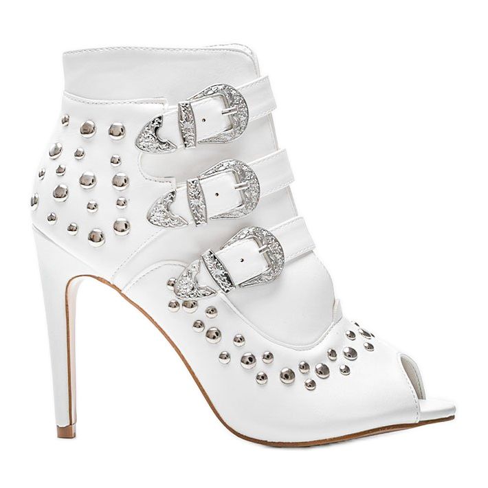 We present the white Abigail stiletto pumps, which combine elegance with a unique style. These stilettos stand out with their beautiful finish, thanks to decorative studs and spectacular buckles in ornaments that give them character. The buckles are attached to elastic bands, which ensures a perfect fit to the foot and comfort when worn.