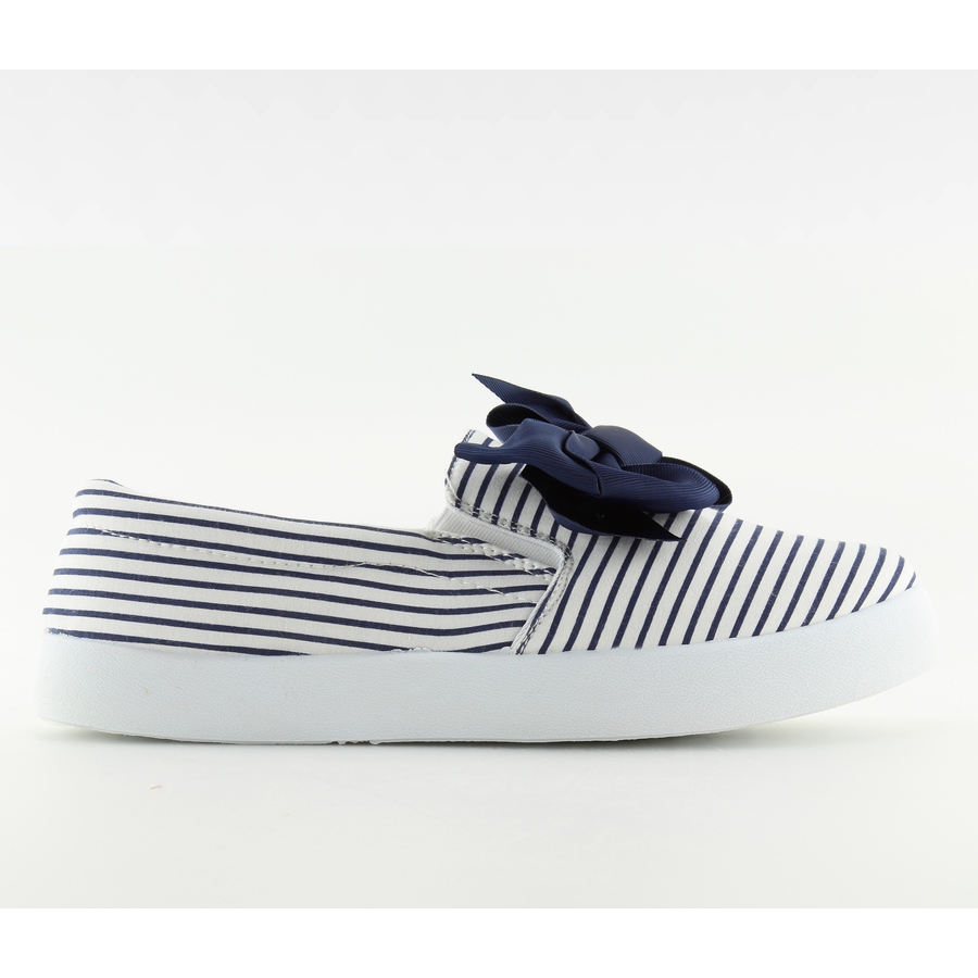 Sailor slipons B860 white/navy blue - light, summer sneakers in a sailor style, perfect for holiday walks and everyday styling. Made entirely of fabric, they delight with a classic combination of white and navy blue and a decorative bow that adds a feminine character. The white, sporty sole (platform/heel height 2.0 cm) emphasizes the casual style and ensures everyday comfort.