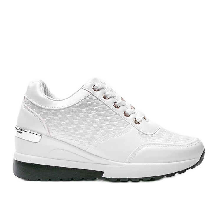 Here are the white shiny Mara wedge sneakers - the perfect choice for modern women who value style and comfort! These unique shoes designed by the Inna brand combine elegance and casual character. Made of high-quality ecological leather, the sneakers attract attention with subtle, shiny embossing and an effective metallic insert on the back of the sole.