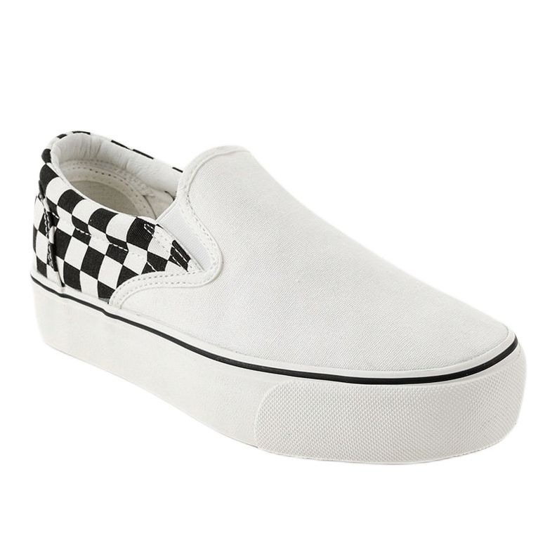 The white slip-on sneakers R-440 black are a perfect combination of comfort and fashionable design that will surely appeal to every woman. These classic sneakers in white are distinguished by an unusual checkerboard pattern visible on the back of the upper, which gives them an original character.