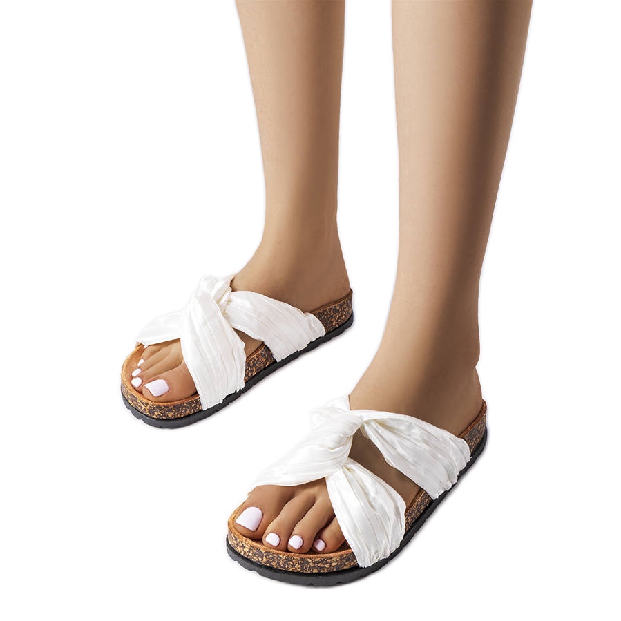 Slippers that will perfectly complement summer casual stylizations. The top is made of pleated fabric intertwined with a cross (fresne material), which gives the model a subtle texture and elegance. The high, cork sole provides comfortable support and fashionable appearance, and the black rubber sole guarantees good grip. The ecological leather insert adds comfort. Standard numbering - please follow your size.
