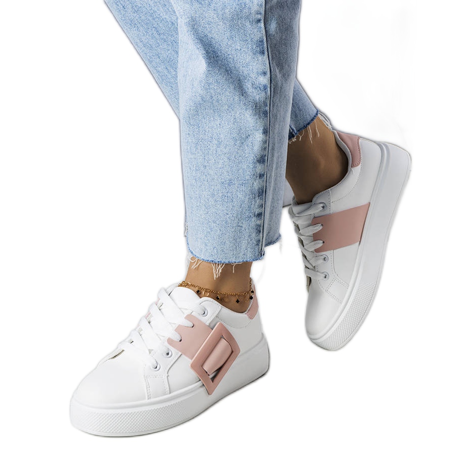 Details: White sneakers decorated with a pink Toni buckle