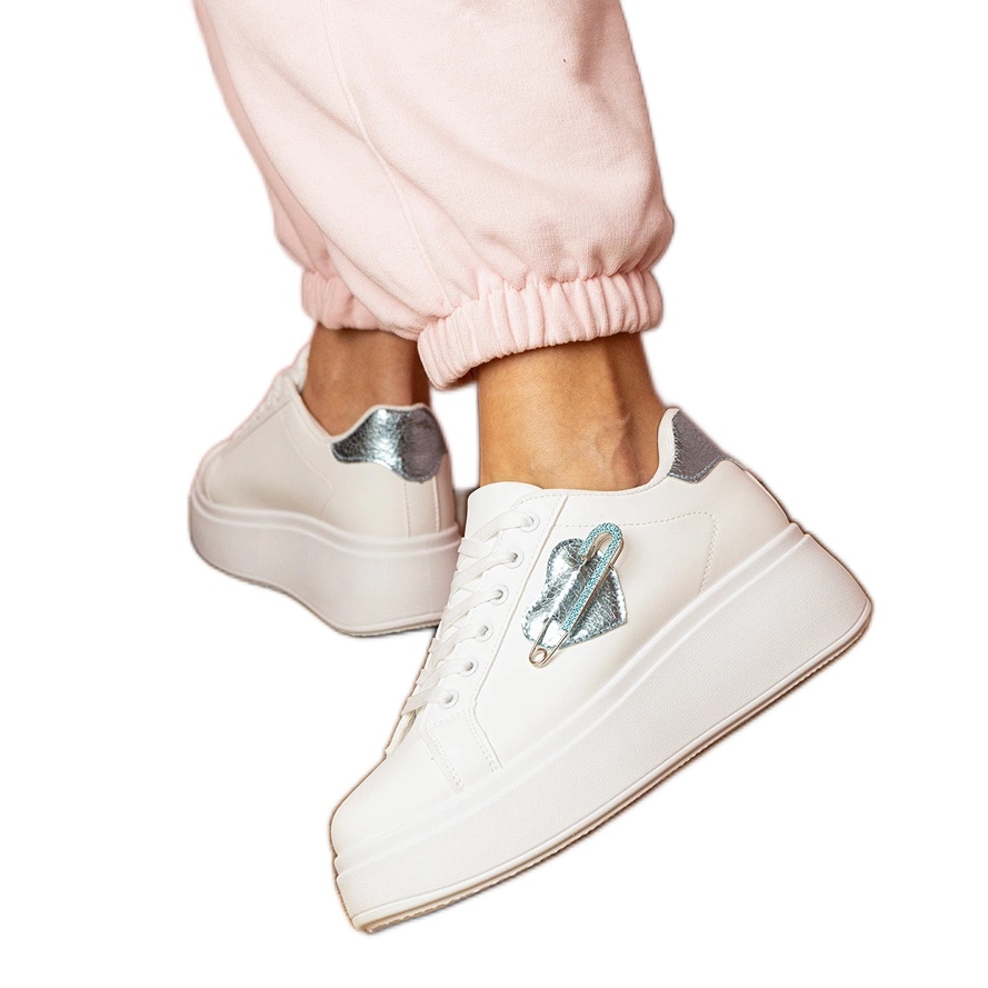 ** White sneakers with blue heart and zircon pins - model 8919 **