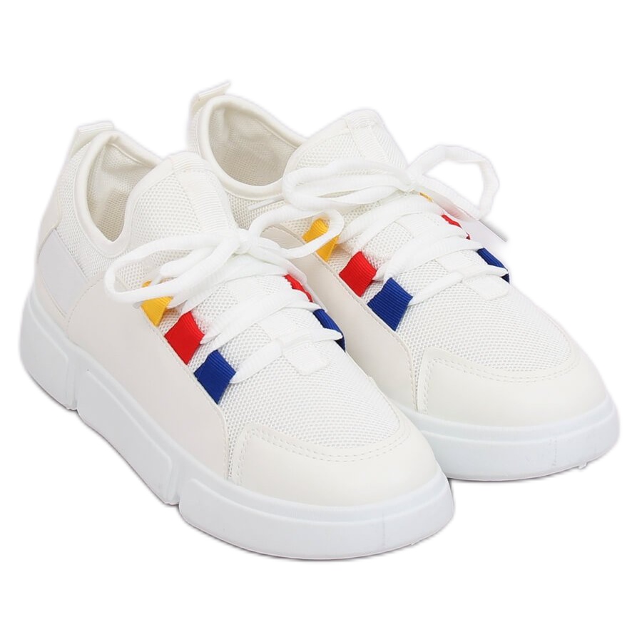 We present white sports shoes 2018-9 White from a well-known brand, which impress with their simplicity and elegance. White is a true fashion classic that never goes out of fashion, and the original, contrasting loops in a multi-color version give them a unique character.