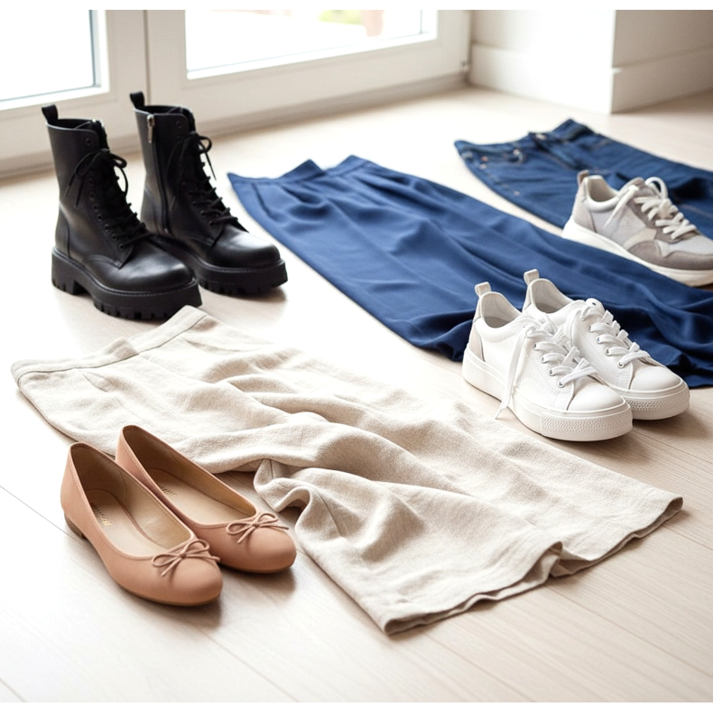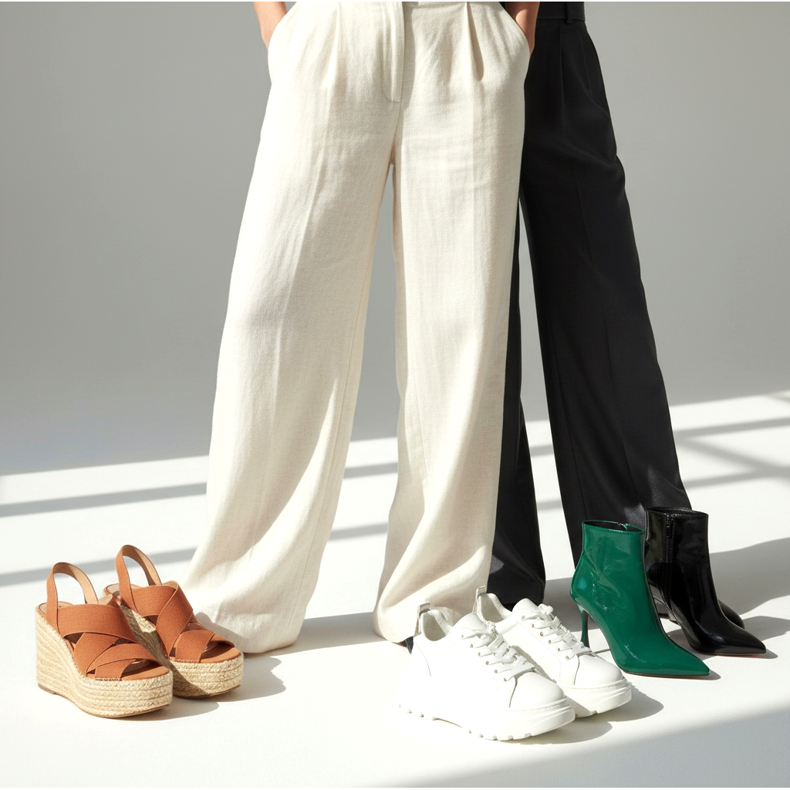 It is also worth avoiding a lot of framed, massive shoes for elegant wide-leg shoes made of delicate material - the contrast between heavy shoes and light fabric may be unexpectedly unfavorable. Coordinate with trousers: Light fabric likes a light partner, and heavier denim can withstand bulkier footwear.