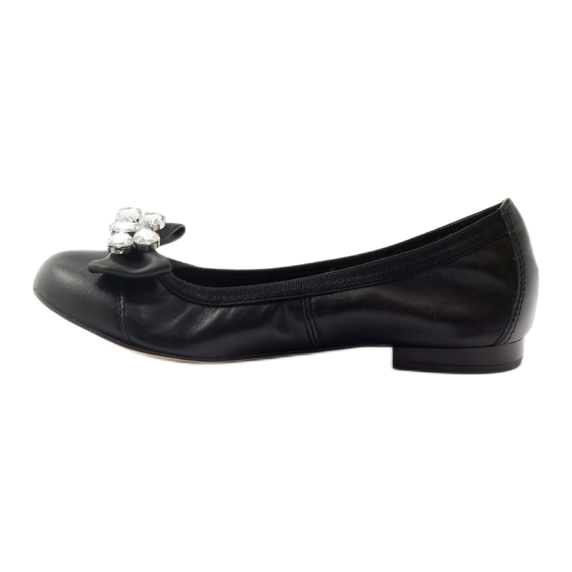 Elegant women's ballerina shoes Gamis model. 1402 - classic with a subtle shine. Made of high-quality natural leather in a universal black color, with a decorative bow studded with crystals that add style while maintaining discreet elegance. The model with a delicate heel (approx. 1.5 cm) is perfect for both everyday use and more formal occasions. The hem fits nicely to the foot, and the leather insole lined with a soft sponge ensures comfort all day long. Slip-on ballet flats with a round toe - a timeless style from the latest spring-summer collection.