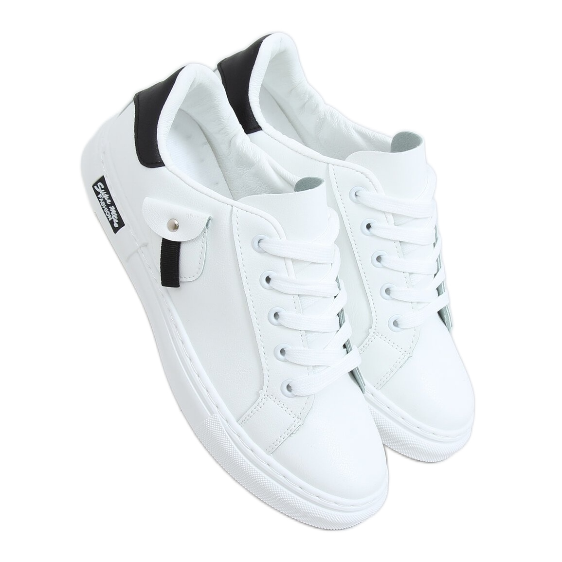 These lace-up sneakers are a classic model that fits perfectly into urban chic. White, decorated with contrasting black elements and an interesting detail - an imitation of a pocket - they will certainly attract attention and add character to your styling.