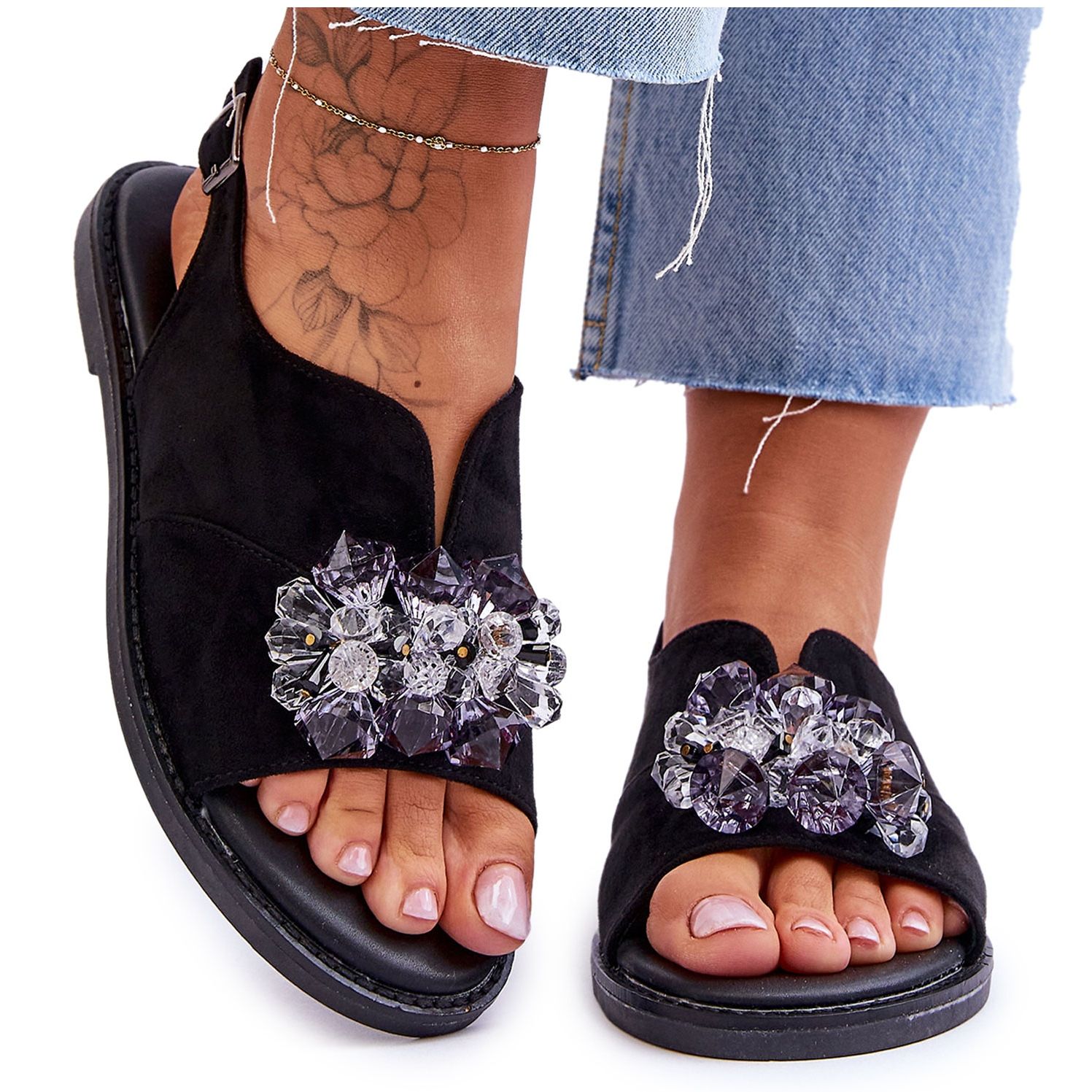 Decorated on the front with plastic stones that effectively imitate diamonds, Vinceza Women's Suede Sandals with Stones Black Mersea will certainly attract attention and add shine to summer stylings. The airy design of the sandals is perfect for both beach walks and evening outings.