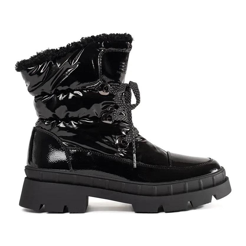 Black snow boots are characterized by a flat heel of 5 cm and a shaft height of 14 to 15 cm, which makes them perfectly protect the legs from the cold. Thanks to the treaded plastic sole, the shoes provide stability and grip on various surfaces.