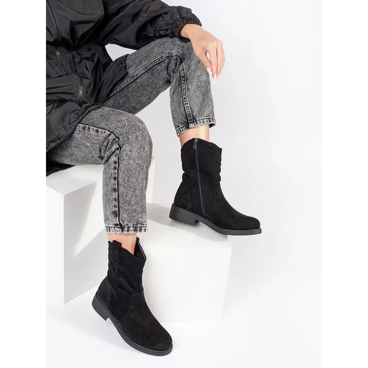 Meet the black suede women's cowboy boots from another brand that combine style and comfort. These elegant shoes are a great choice every day, ideal for women who value fashion and comfort. Made of ecological suede in black, they look extremely chic, and their casual style makes them easy to combine with various outfits.