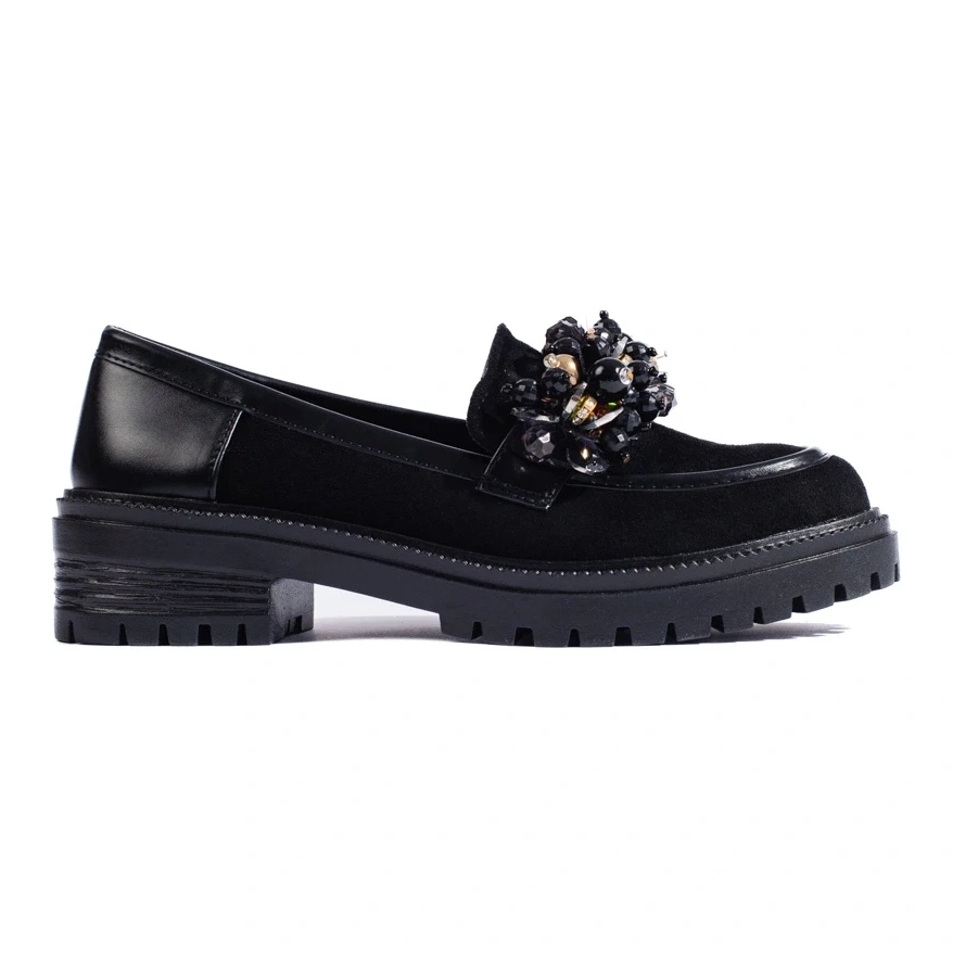 Elegant and comfortable - black Shelovet loafers are a proposal for women who value the combination of urban style with the comfort of wearing. Made of ecological leather in a suede finish, with a delicate accent in the form of zirconia, will work for both everyday and more elegant stylizations.