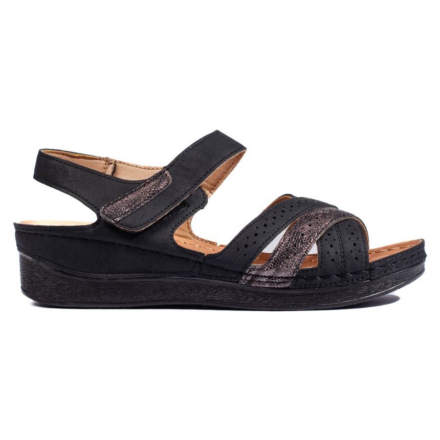 We present elegant women's black Velcro sandals from a reputable brand. These classic sandals are perfect for various occasions, from evening events to everyday stylizations. Made of high quality ecological leather, they offer not only a fashionable look, but also wearing comfort.