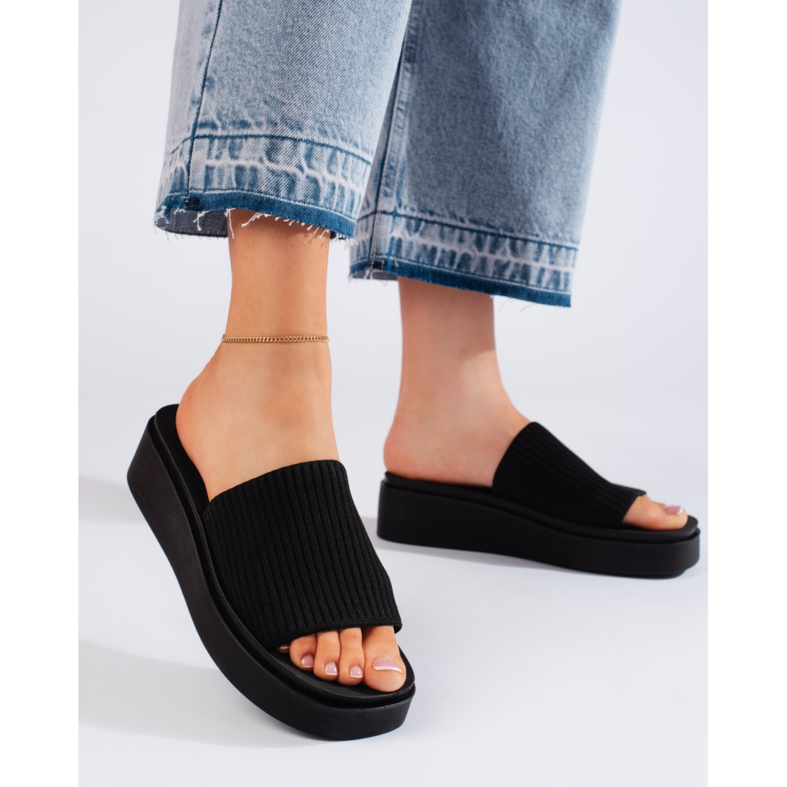 Thanks to the 5 cm high wedge, the flip-flops add optical lengthening to the silhouette, while guaranteeing stability and comfort while walking. The simple, classic design in a universal black color makes these flip-flops fit perfectly into a casual style, matching many summer styles - from everyday outfits to more elegant combinations.