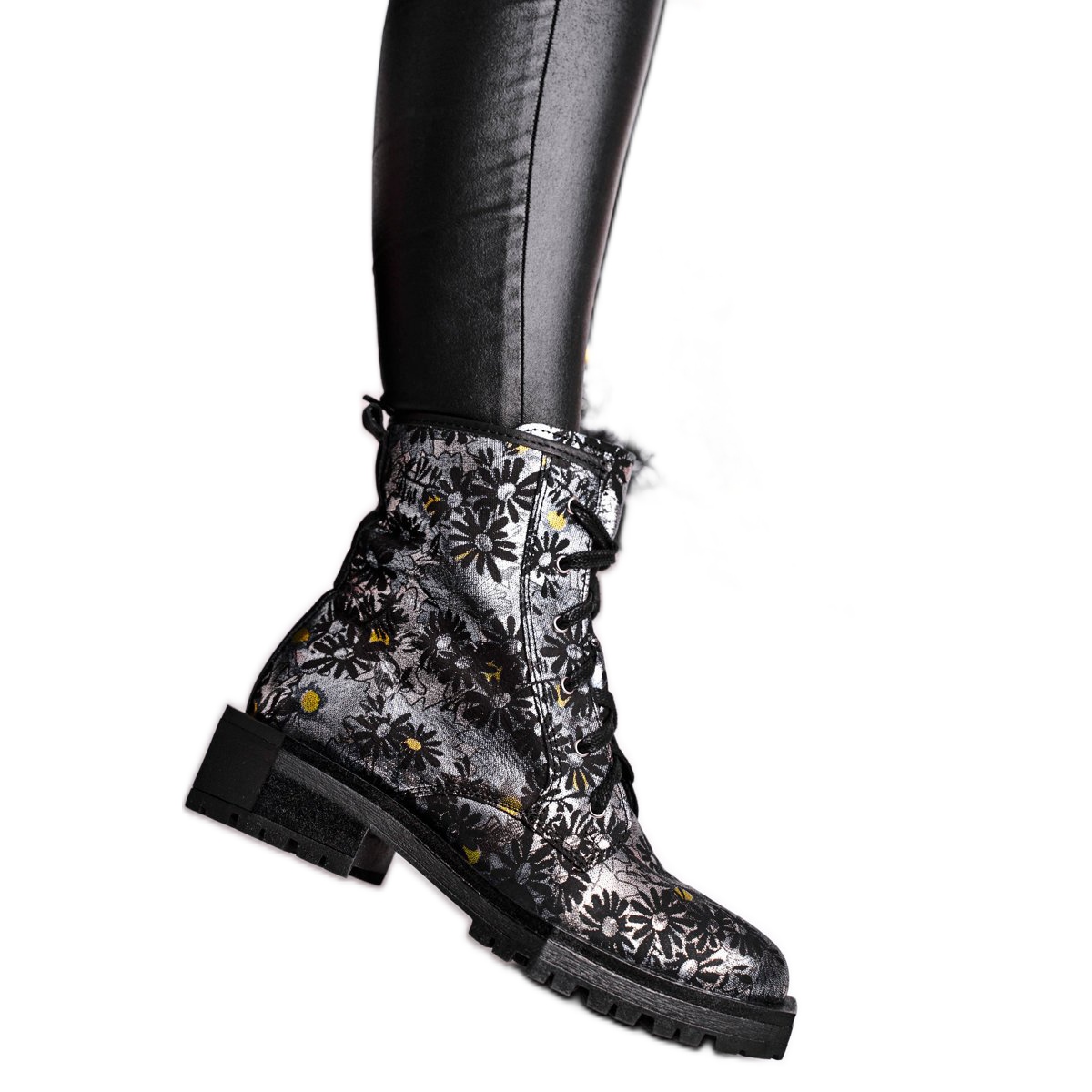 Each element of Maciejka's boots was designed with details in mind. High-quality natural leather not only guarantees durability and comfort, but is also a canvas for eye-catching silver flowers that give the shoes a unique character. The originality of these boots is also emphasized by the trapeze, square sole, which combined with the black color and multi-colored pattern makes them a perfect choice for many occasions.