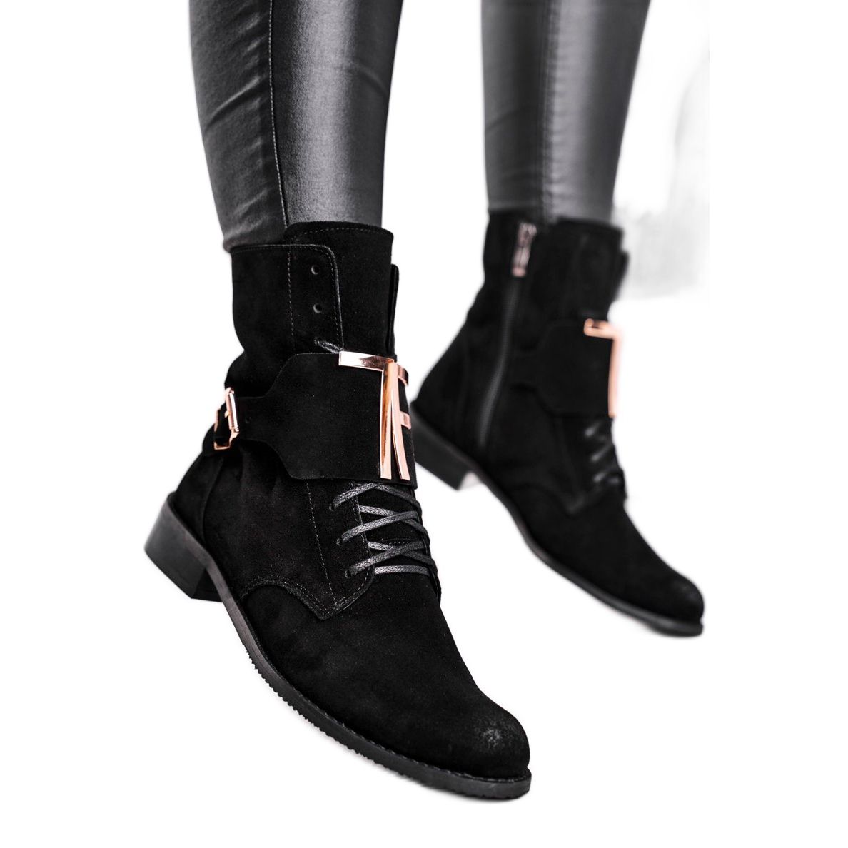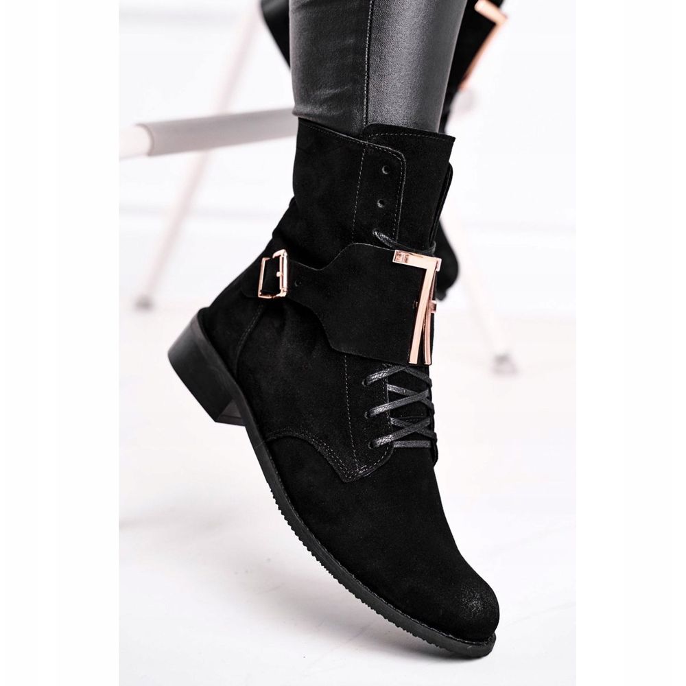 Thanks to the decoration in the form of a large buckle and gold letters, the boots gain a unique character that perfectly fits into fashion trends. Their practical sewing on the side of the zipper makes it easier to put on, and additional laces allow for a perfect fit to the foot.