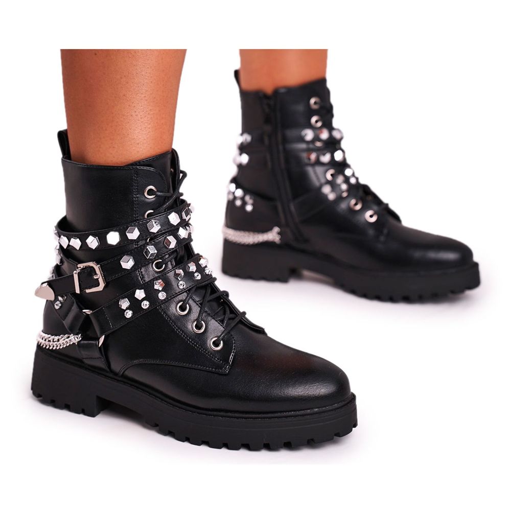Discover the latest model of women's ankle boots from FB2, which impress not only with their style but also with their functionality. Warm Rhinestones Chains ankle boots in an elegant black color are an ideal proposition for women who value strong accents in their stylings. Their rock character is emphasized by spectacular straps decorated with silver rhinestones and stylish chains, which gives them a fashionable, avant-garde expression.