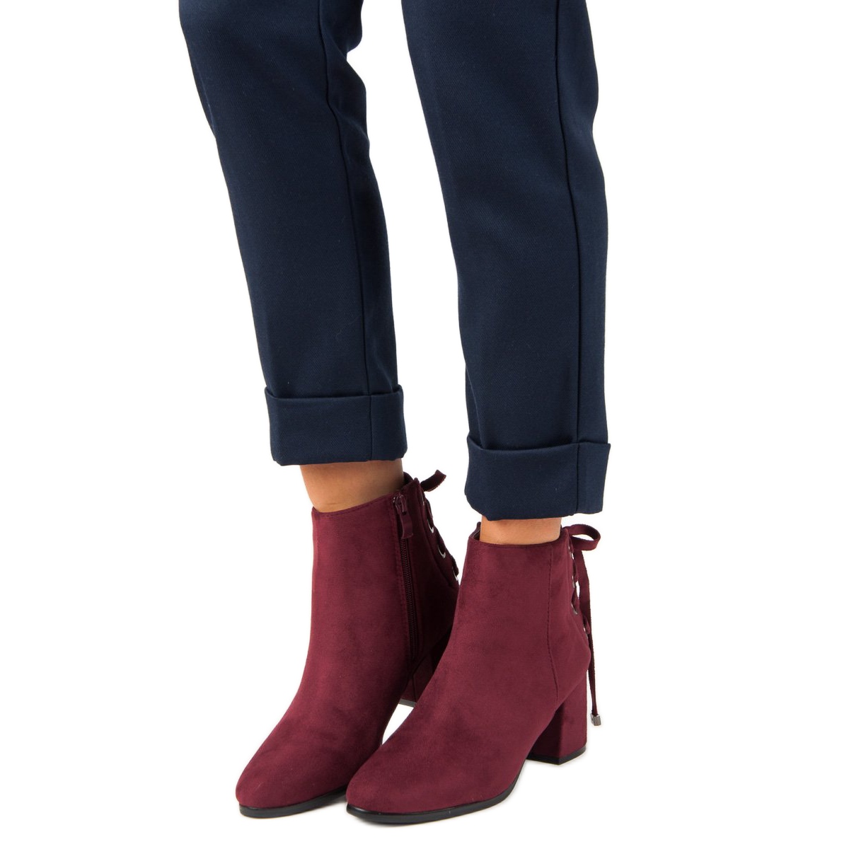 Are you looking for footwear that will add character to your styling? Here are red women's ankle boots with ties that will delight every fashion lover! Made of high-quality ecological suede leather, these shoes stand out not only with their intense color, but also with a unique cut that attracts attention.