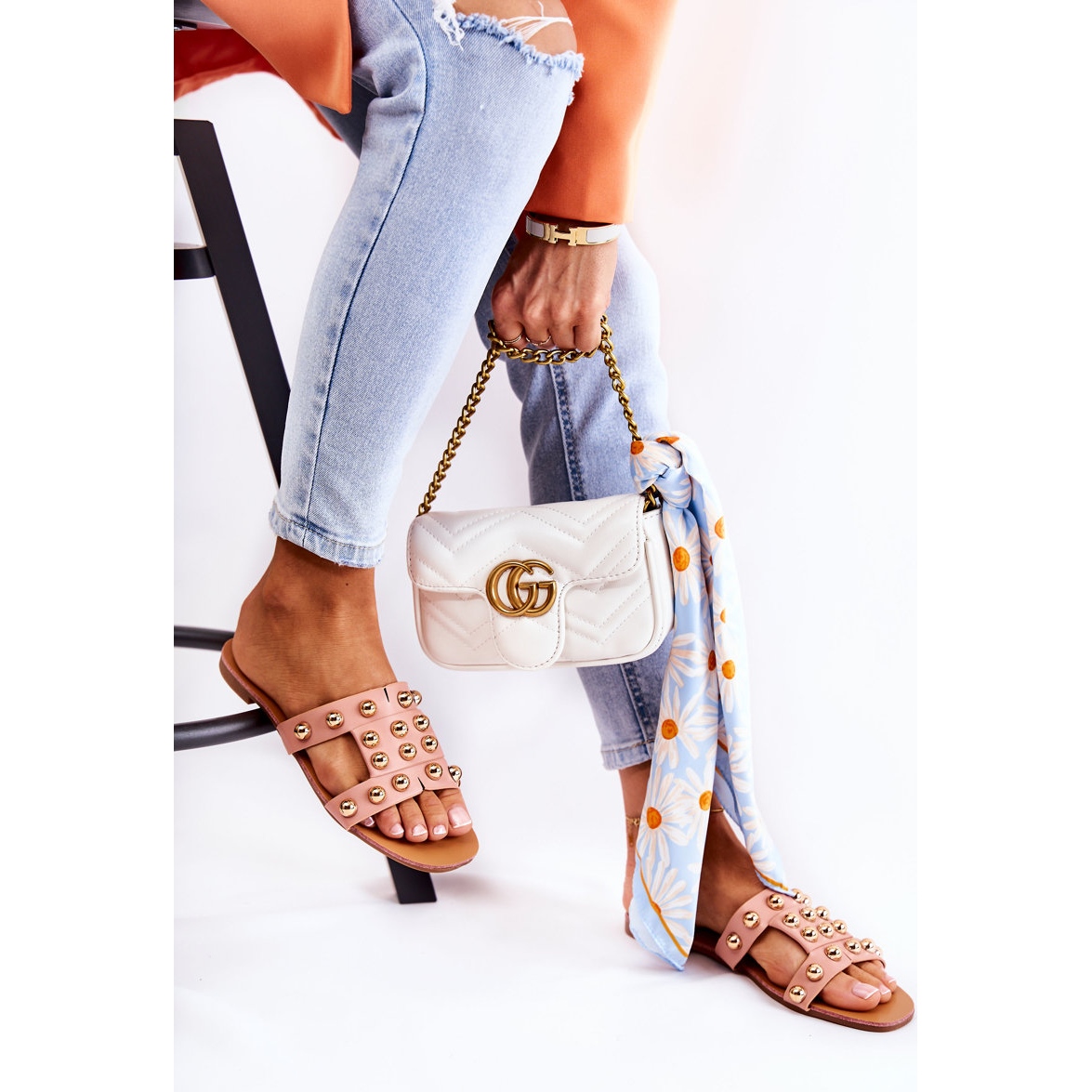 Discover the classic PG1 women's flip-flops, which will be a great choice for hot days! Made of high-quality eco-leather, these pink flip-flops stand out with delicate cuts on the straps and beautiful mirror decorations in the form of half-balls, which add elegance and style.