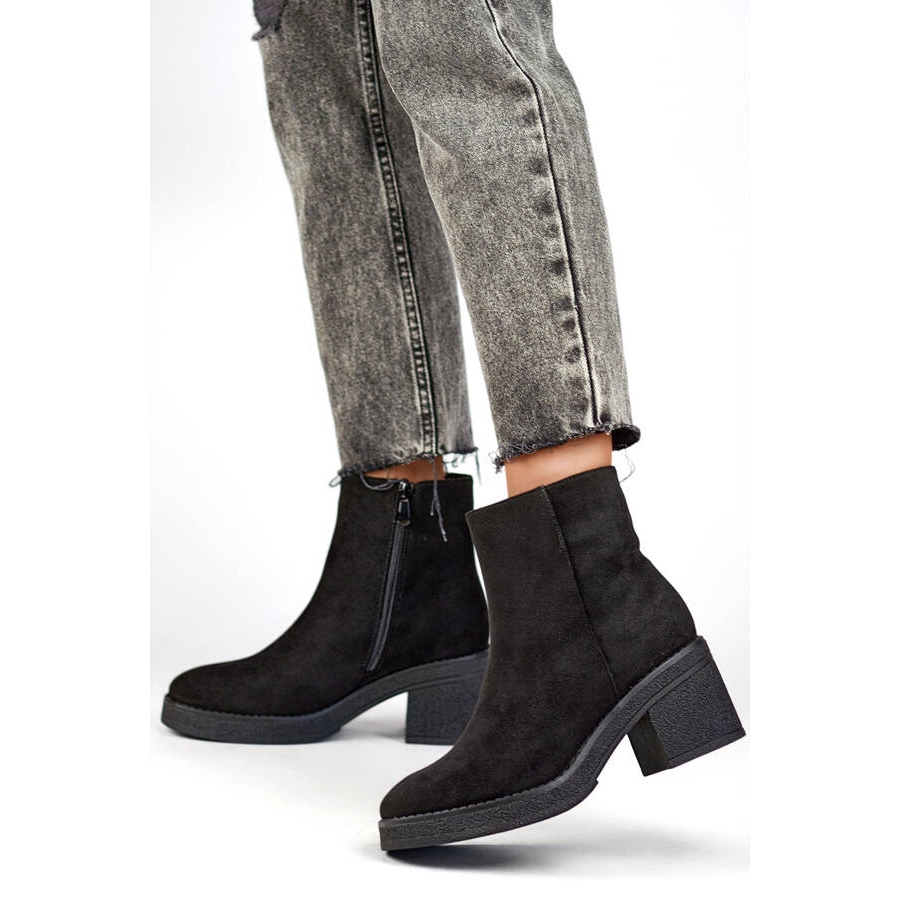 Made of ecological suede, boots present an elegant, black color, which makes them a great base for many styles. The zip fastener allows quick and convenient putting on and taking off shoes. The ecological leather insert provides comfort when walking, and the standard stretch makes the boots adapt well to the foot.