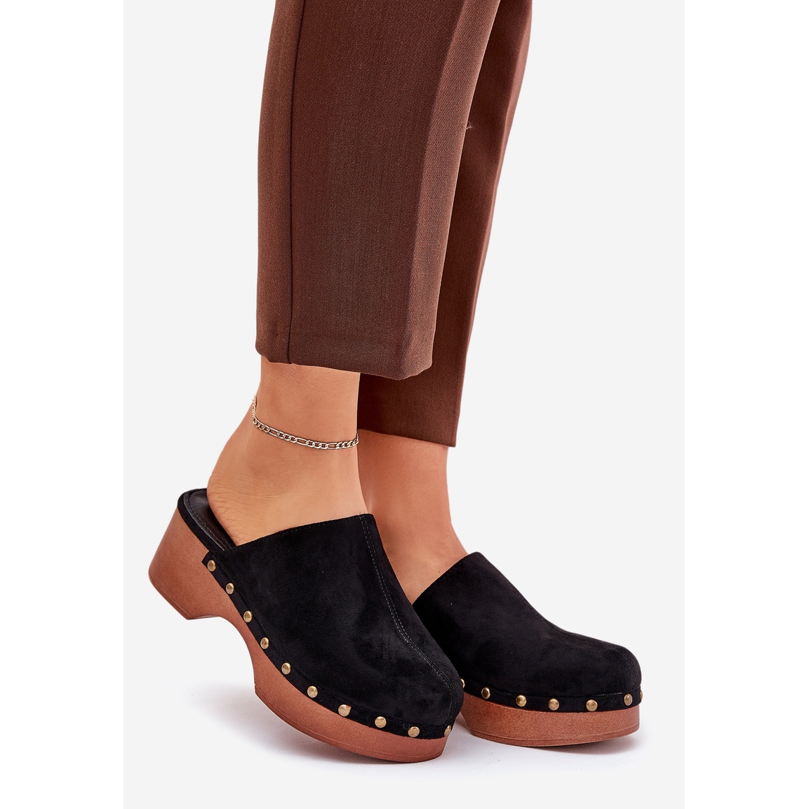 Discover a new dimension of comfort and style with our black women's flaps with studs made of eco suede! These light clogs combine fashionable design and comfort, which makes them the perfect choice every day. Set on a 6 cm high wedge and 3 cm platform, they provide excellent support and stability.