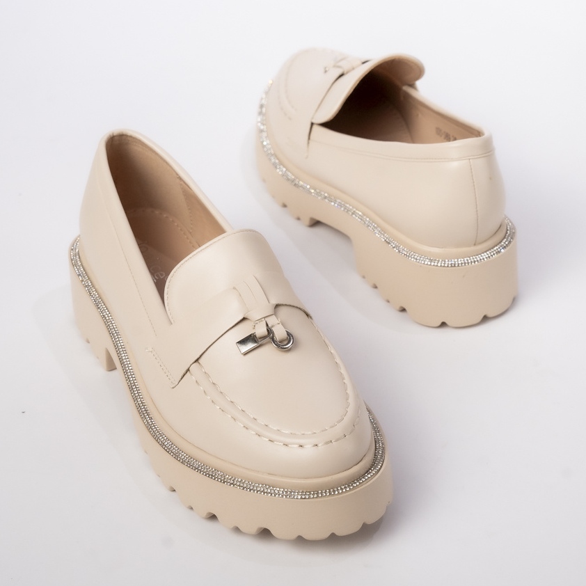 A thick, retreaded sole provides not only comfort, but also stability when walking, which is extremely important on an intensive day. Subtle decorations in the form of zirconia and fringes add a unique character to the shoes, making even the simplest stylizations acquire a stylish accent.