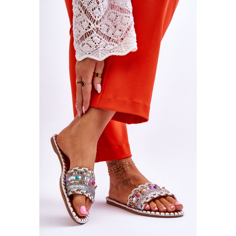 Decorations in the form of rhinestones, studs, glitter and braided fabric give the flip-flops a unique character, making them an ideal choice for everyday use and special occasions. The insole made of eco-leather, subtly decorated with thread, guarantees comfort of wearing, and the flat 1 cm heel and non-slip sole ensure stability and safety when walking.