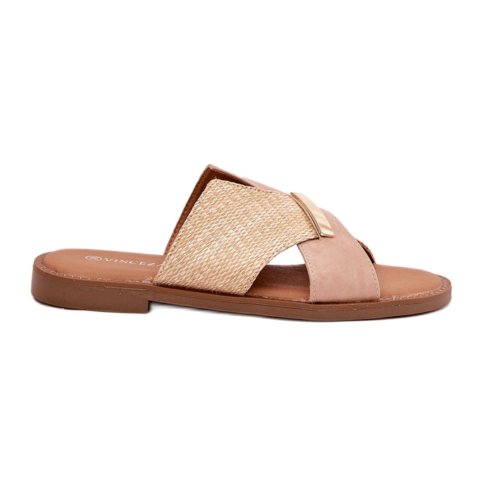 Women's Vinceza 17385 flat -heeled slippers in beige is the perfect choice for summer days, combining elegance with comfort. Made of high quality eco leather, they not only provide a stylish look, but also comfort at every step. Thanks to the insertion, putting on and removing the flaps is extremely simple, and a flat heel with a height of 1.5 cm guarantees stability and comfort of wearing all day.