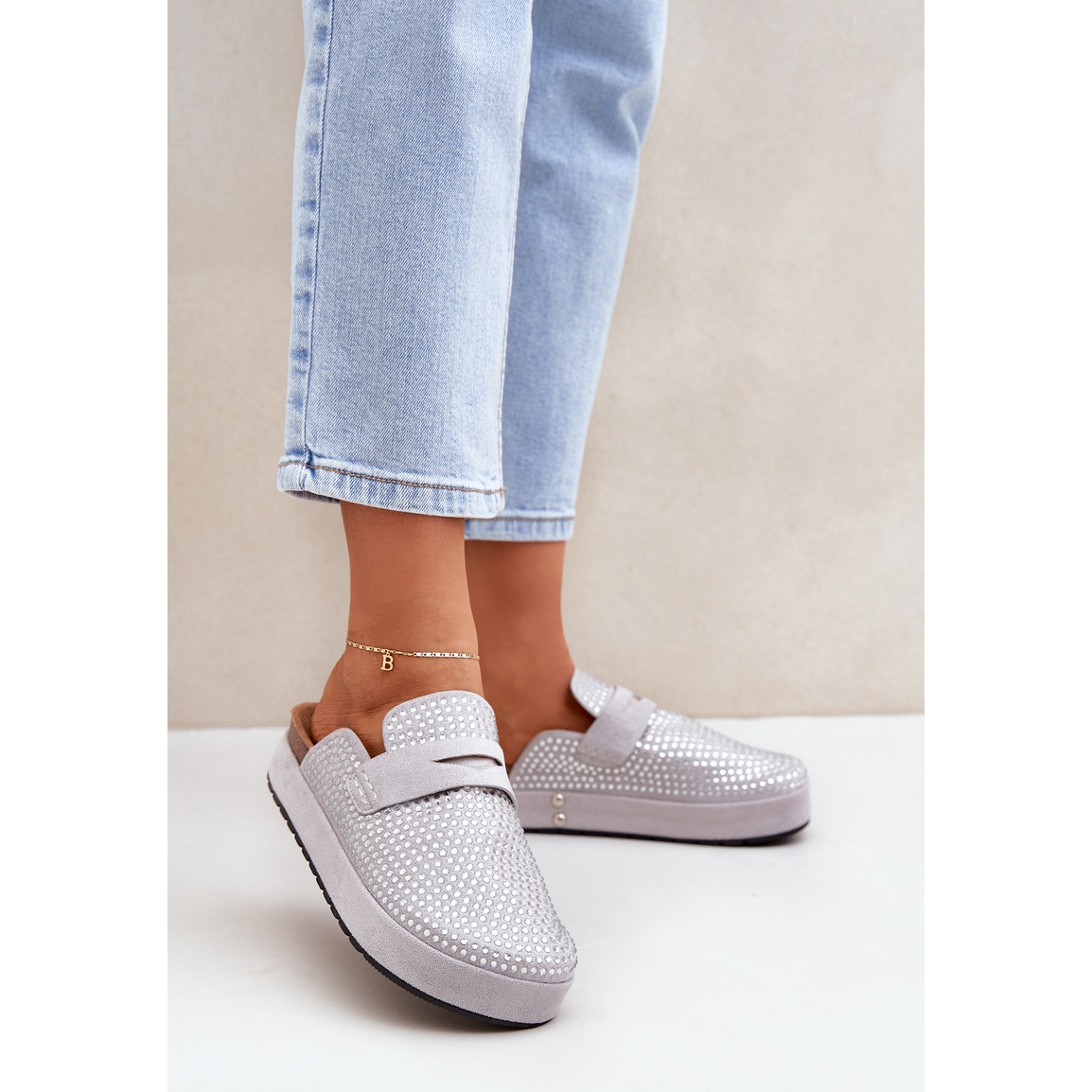 Discover the unique style and comfort with women's flip flops decorated with zircons on the platform in an elegant gray shade. Made of high quality eco suede, these flip flops are the perfect choice for spring and summer days. Their rounded nose and a profiled insert ensure comfort of wearing, even during long walks.