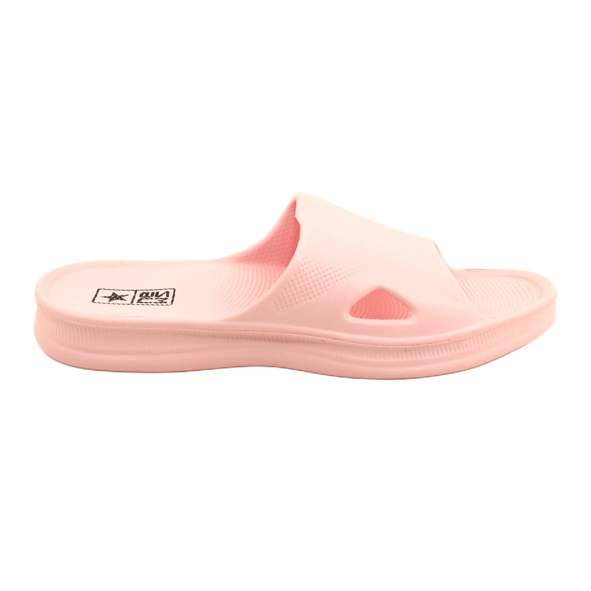 Delicate, comfortable and ready for vacation - pool flip flops in powder pink are the perfect choice for the beach, for shower and for everyday wearing in the summer. Made entirely of high quality rubber-sand material, they are light and durable. The insert with a subtle pattern gently massages the foot at every step, ensuring comfort even during longer use. A classic, simple upper and uniform color give them a universal, fashionable look - just put them on to feel the holiday mood.