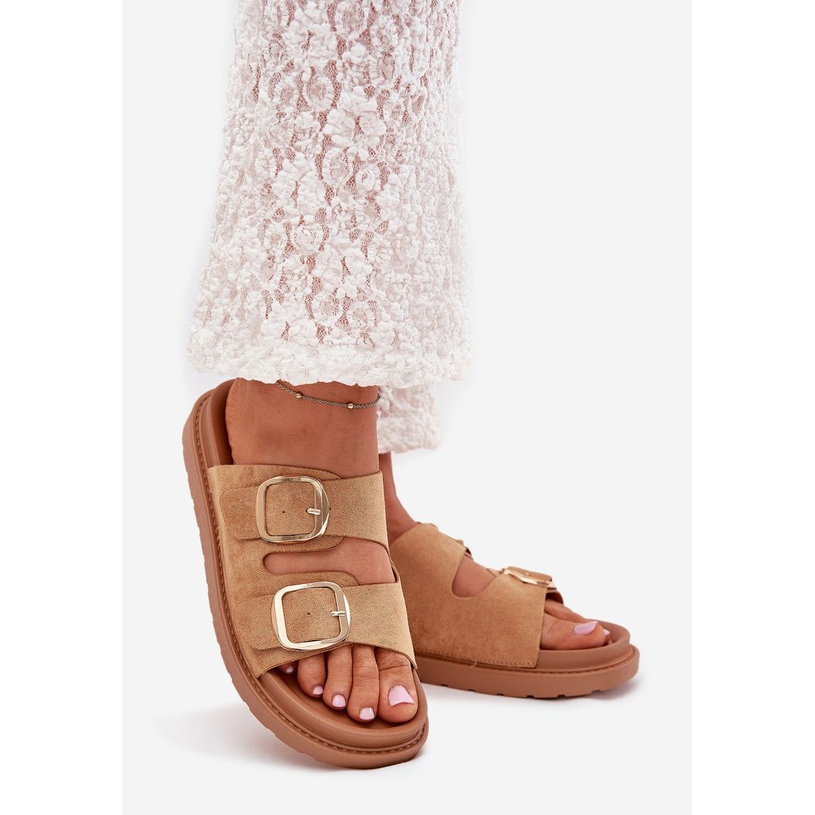 We present the women's flip-flops bots women's flip flops on the platform with golden brown Camel Veren buckles-the perfect choice for spring-summer days! Made of high quality eco suede, these stylish flip flops combine elegance and comfort. Set on a 3.5 cm high platform, they provide great foot support, which makes them perfect for daily outputs.