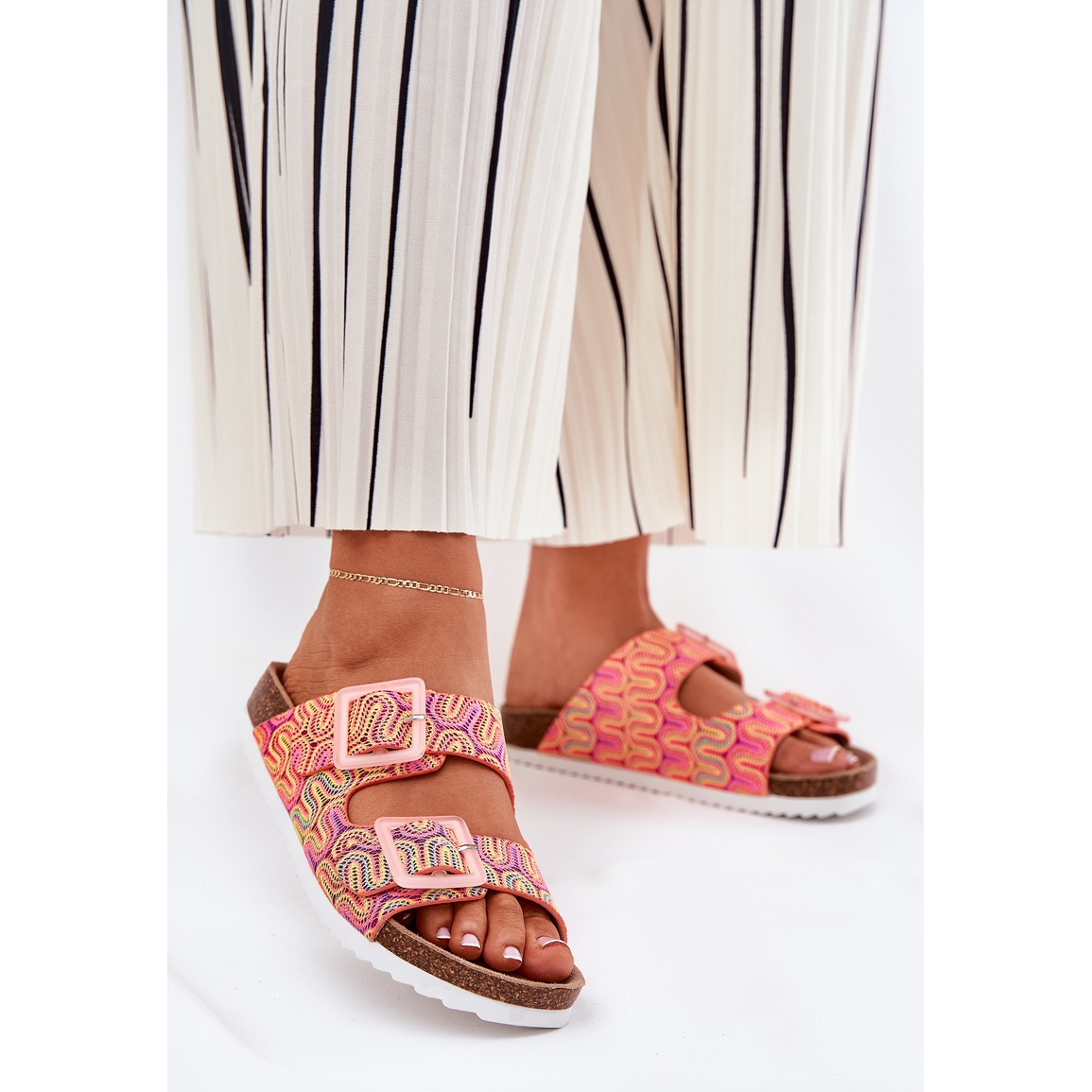 Women's flip flops with buckles and glitter S. Barski RB51-006 in orange is a great choice for every fashionable woman who values comfort combined with the original style. Made of high quality textile material, these patterned flaps are embedded on a stable cork platform with a height of 3 cm, which ensures comfort of wearing all day.