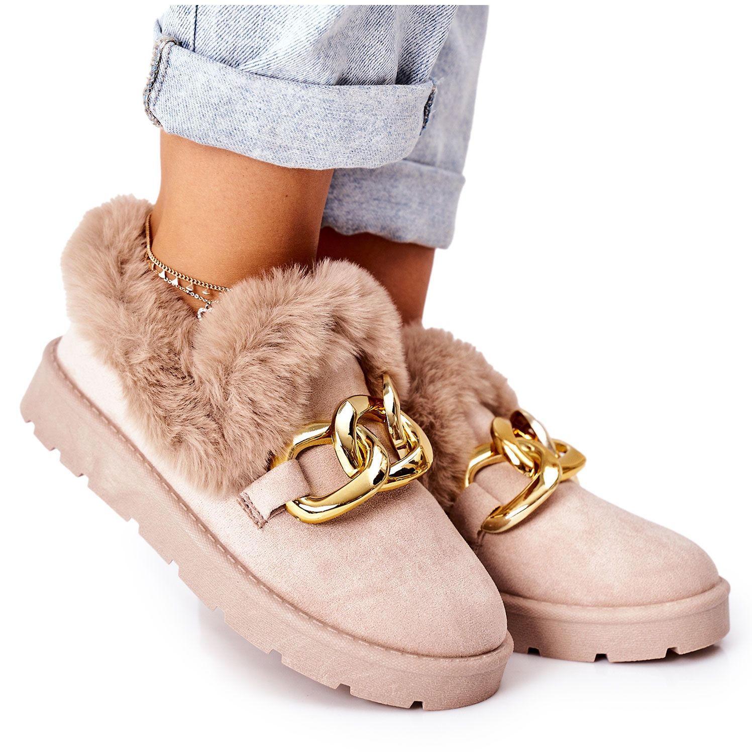 Made of pleasant to the touch synthetic fur, they offer warmth and comfort that you will appreciate on long winter evenings. The gold chain that decorates the slippers gives them a unique character and makes you feel stylish in them, even at home. The slippers have a round toe and a flat heel with a height of 3 cm, which ensures comfort for everyday use.