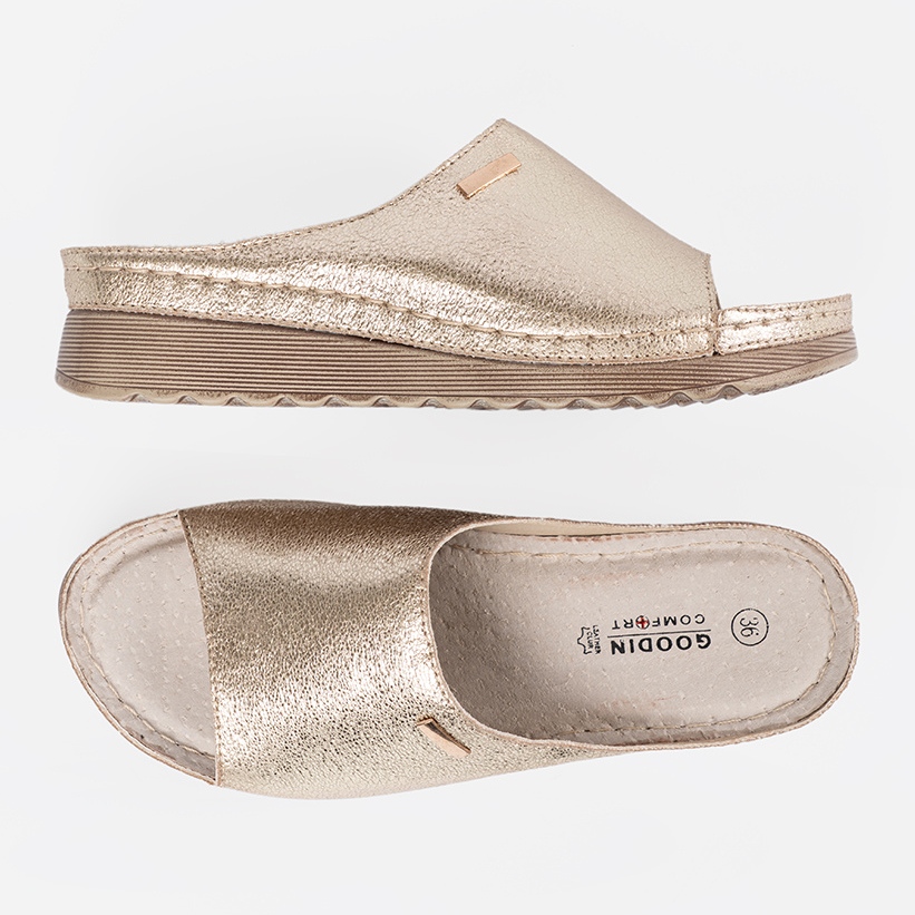 Discover unparalleled comfort and unique style with Goodin female flaps in a golden shade. These elegant flip flops, made of ecological suede leather, are the perfect choice for women who want to combine fashion with comfort. Thanks to the sliding cut and open fastening, putting them on is extremely simple, which makes them a perfect solution for summer days.