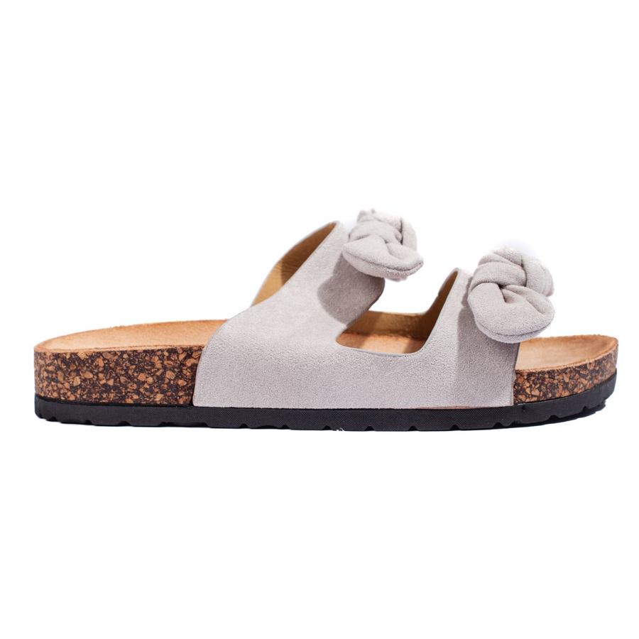 The outer material made of ecological suede leather adds subtlety and elegance, and their open heel and lack of nose make them the perfect choice on warm days. The gray color introduces an elegant accent that goes perfectly with casual stylizations. In addition, the flip flops are decorated with a charming bow, which gives them a unique character.