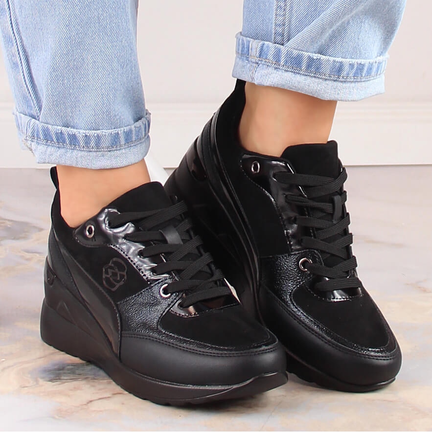 Discover elegance and comfort with women's lace-up wedge shoes from the renowned eVento brand! These black shoes, designed with fashionable women in mind, are an absolute hit of the season. Set on a stylish 6.5 cm wedge, these shoes go perfectly with a variety of styles - both everyday and sports.